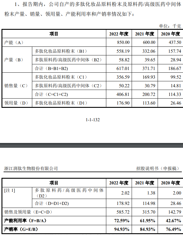 不过,湃肽生物主要产品的产能利用率并不高。2020到2022年,公司多肽化妆品原料粉末及原料药/高级医药中间体粉末的产能利用率分别为42.67%、61.95%、72.59%。虽持续提升,却仍不足8成。报告期内,多肽化妆品原料原液的产能利用率更是低于20%,分别仅为6.87%、18.06%、18.36%。