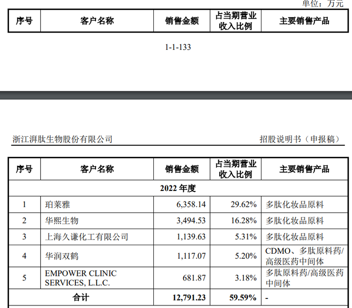 招股书显示,湃肽生物的客户集中度较高,2020-2022年,公司对前五大客户的销售收入分别为4832.87万元、7860.75万元和1.28亿元,占公司营业收入的比重分别为56.09%、55%和59.59%。就2022年而言,仅珀莱雅及华熙生物就分别为湃肽生物带来6358.14万元和3494.53万元的营收,占比分别为29.62%和16.28%。