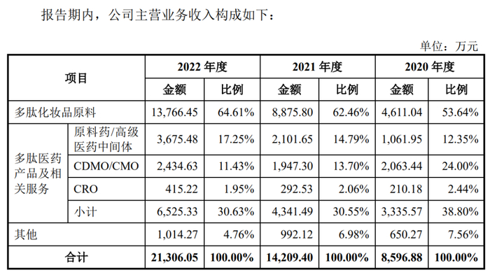从具体业务来看,报告期内,湃肽生物的多肽化妆品原料销售是公司的营收主力,2020-2022年分别为53.64%、62.46%、64.61%。