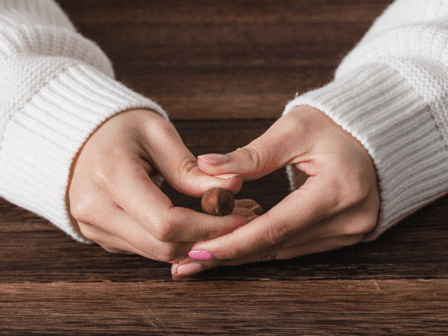 相传越王勾践也曾问西施如何剥食香榧,只见西施捏住香榧头大的一端,找到两个凸起的小点,轻轻一按,果壳自然开裂。