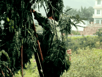 果农们每年都是爬上十几米高的竹梯,一颗一颗小心翼翼地徒手采摘。