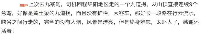 “01年去九寨沟旅游坐的中巴,成都出发,单程14个小时,路上我被吓哭了,有一段路叫九道拐,那天我明白了什么是蜀道难。”