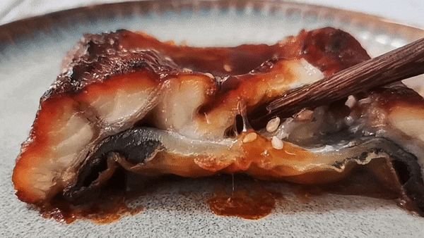 看这鳗鱼的切面,肉质实在是肥厚!小编用筷子夹了一下,能感受到到它的饱满、有弹性、柔嫩却不松散,皮与肉之间还有一层肥美的胶原蛋白。