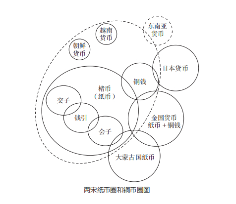 东部和南部的铜币圈。两宋时期,中国铜币成为东北亚、南亚、东南亚的硬通货。东北亚的高丽国和日本长期处于中国的铜币圈。高丽虽然出产铜,但在宋崇宁(宋徽宗年号,1102—1106年)之前,不懂铸钱。崇宁之后,逐渐学习掌握了铸钱技术,开始铸造和使用铜钱,建立铸币系统。但是,由于铸造能力有限,铸造的铜钱质量也不如宋钱,宋钱是高丽境内长期的主要货币。中国隋唐时期的铜币已经流行于日本,宋钱在南宋覆灭之后的镰仓时代(1185—1333年),依然被市场接受。