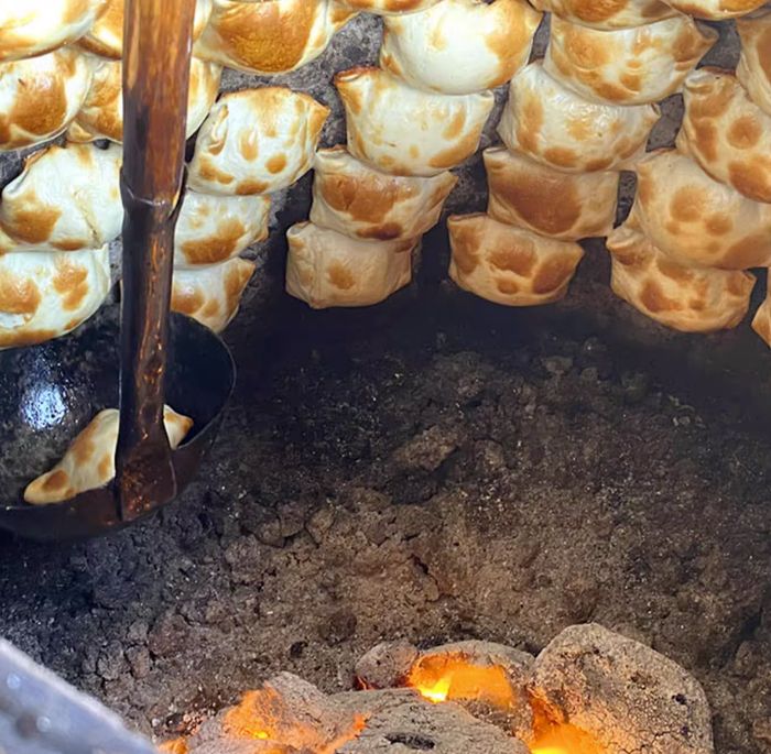 烤包子主要在馕坑烤制,馕坑火点燃后,等待炭火形成,就可以将包子一个个放入,贴满热馕坑壁烤制。