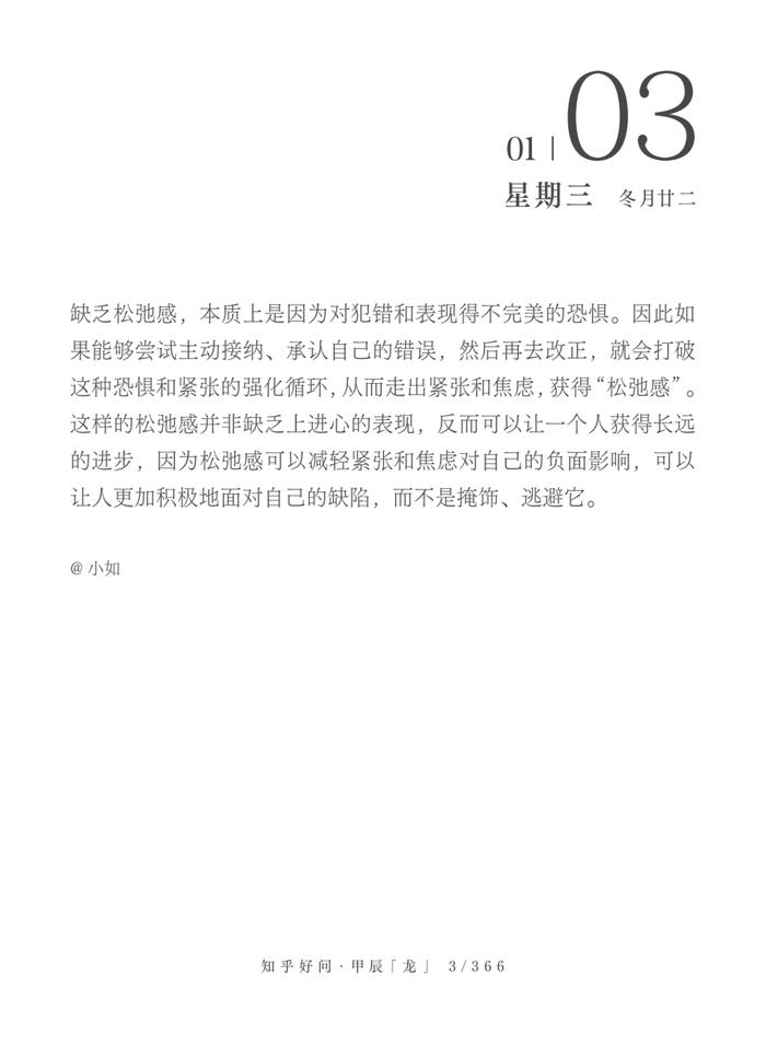A:缺乏松弛感,本质上是因为对犯错和表现得不完美的恐惧。因此如果能够尝试主动接纳、承认自己的错误,然后再去改正,就会打破这种恐惧和紧张的强化循环,从而走出紧张和焦虑,获得“松弛感”。这样的松弛感并非缺乏上进心的表现,反而可以让一个人获得长远的进步,因为松弛感可以减轻紧张和焦虑对自己的负面影响,可以让人更加积极地面对自己的缺陷,而不是掩饰、逃避它。