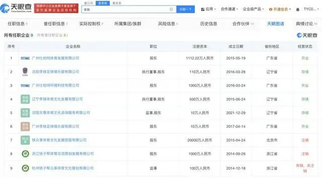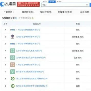天眼查App显示,李铁共关联9家企业,其中6家为存续状态,除上述公司外,还包括广州仕伯特体育发展有限公司、沈阳李铁足球俱乐部有限公司、辽宁李铁体育文化发展有限公司等,均与体育相关。李铁在上述6家企业中均持有股份,同时在沈阳李铁足球俱乐部有限公司、辽宁李铁体育文化发展有限公司担任执行董事,在沈阳天意体育文化咨询服务有限公司担任监事。