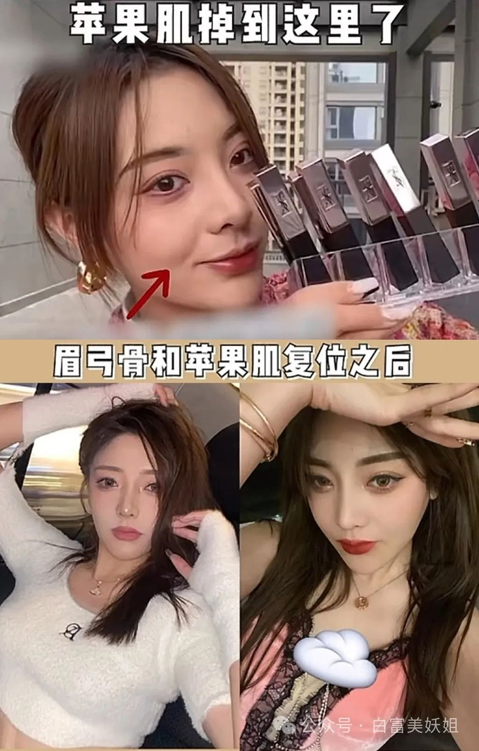 说回温精灵,搞完眉弓后,她发现自己的苹果肌掉下来了,就去做了苹果肌复位。