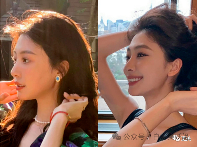 鼻子是高了,但是鼻梁假体过高,完全忽视了鼻额角的衔接,导致鼻子与整张脸格格不入。过高的鼻起点还拉长了她的面中部,让脸更长、气质更成熟。