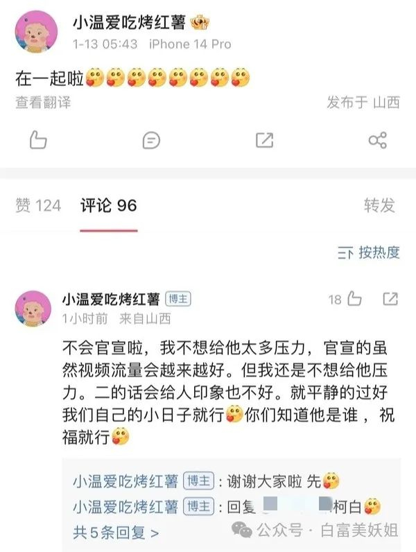 @温精灵连发三条微博官宣和网红@柯白的恋情,