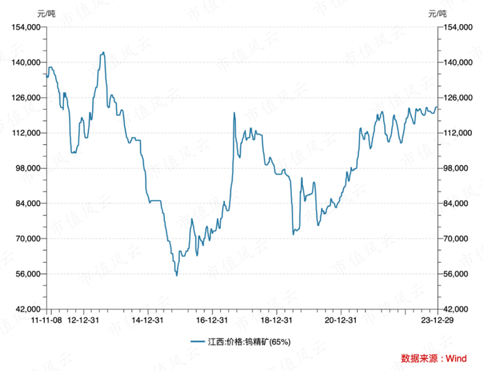 要知道,整个2022年我国硬质合金相关需求和产品产量同比都是下滑的——产量同比下降2.65%,2023年需求更加疲软,但是2022年以来钨精矿价格最近一直稳定在12万/吨以上。