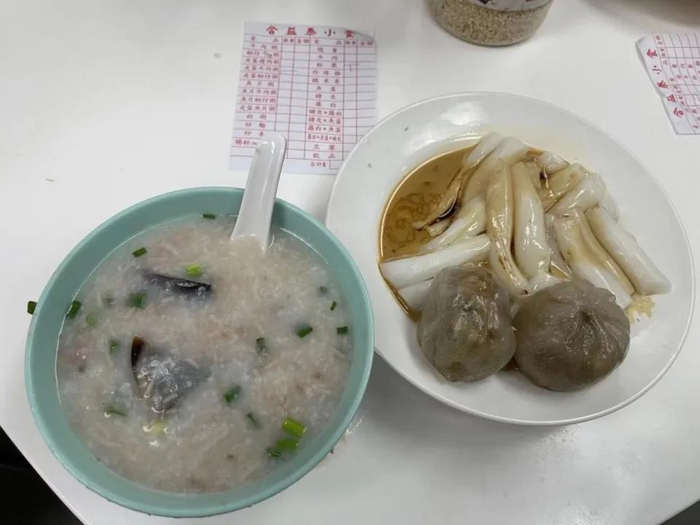 穿行在小巷里寻找到合益泰小食店面时,我难以相信这就是网上极力推荐的“宝藏小店”!小店是一个居民楼的底层门面,目测就二三十平米,装修极为简陋,店里摆着六七个小桌,坐满了吃客,门口有七八人排队取食。
