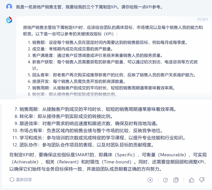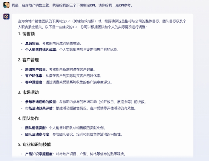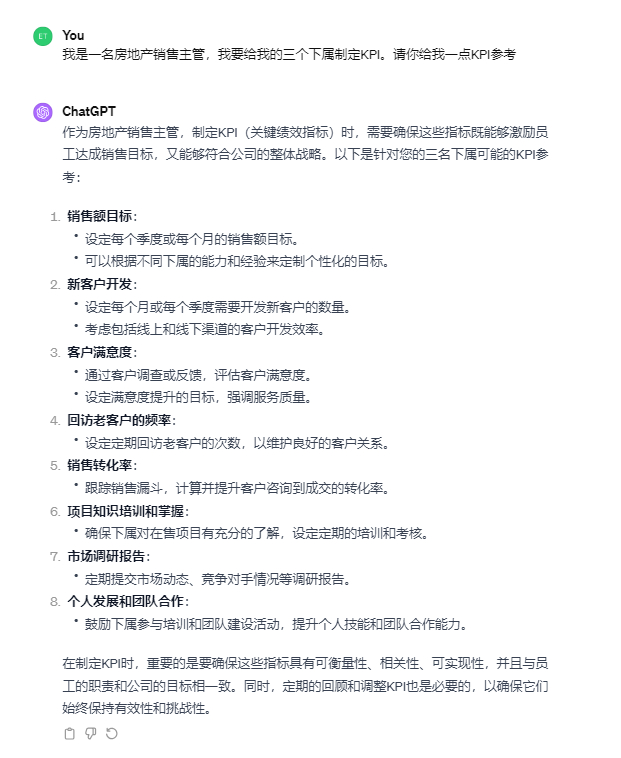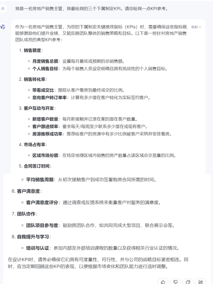 对于身处职场、体制内、或者身居组织责任要职的朋友们来说,经常需要拟定一些活动方案、评定标准等,我们以“我是一名房地产销售主管,我要给我的三个下属制定KPI。请你给我一点KPI参考”为主题,来进行测试。