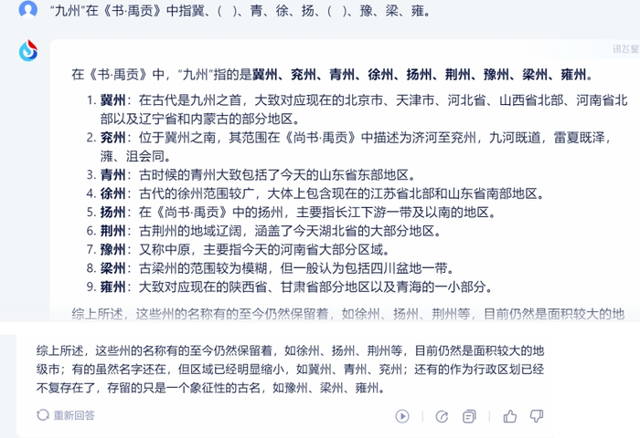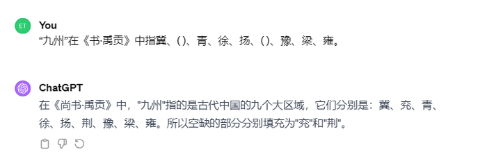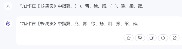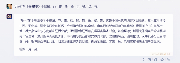 接下来是历史人文知识,我们用““九州”在《书·禹贡》中指冀、( )、青、徐、扬、( )、豫、梁、雍。”这个问题来考验。这个问题比较小众,属于“查资料”型题目。
