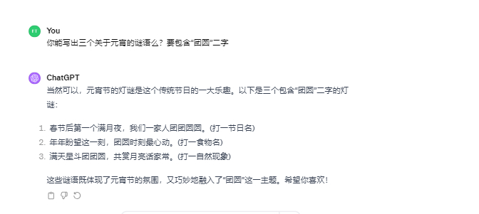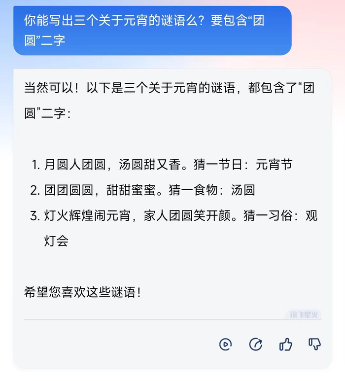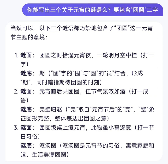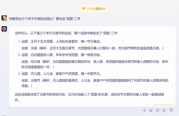 为了测试文本生成能力,我们向四个大模型提问了同一个问题:“你能写出三个关于元宵的谜语么?要包含‘团圆’二字”。这个问题的条件有两个:1.关于元宵;2.包含“团圆”二字。