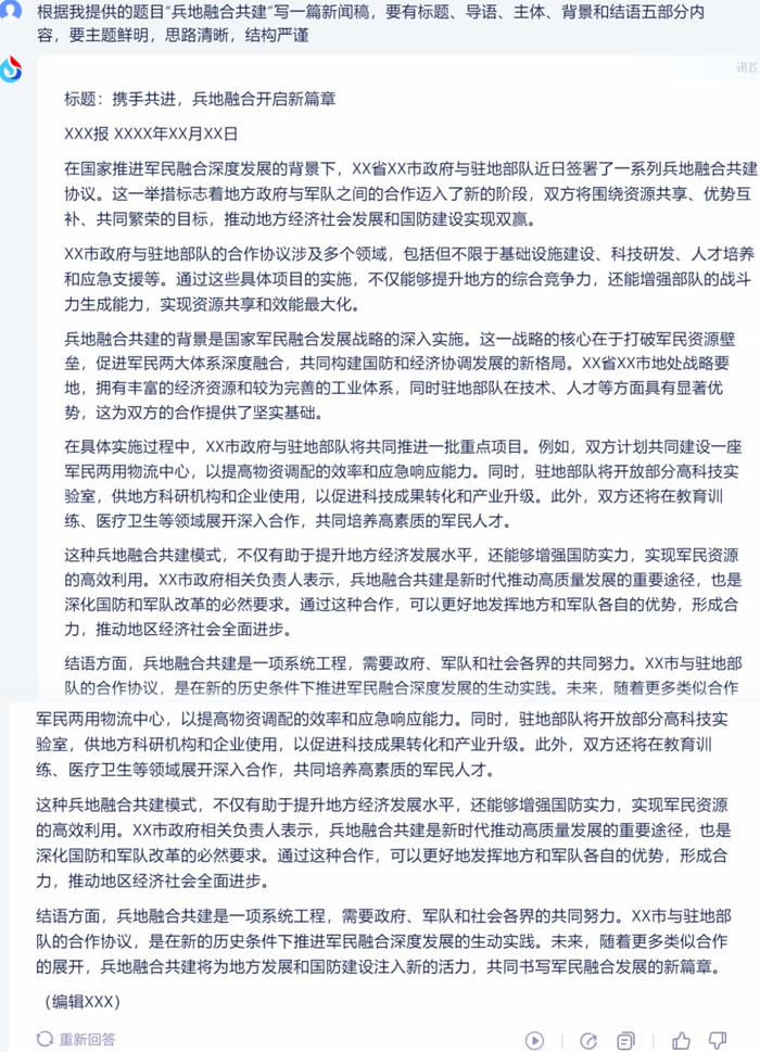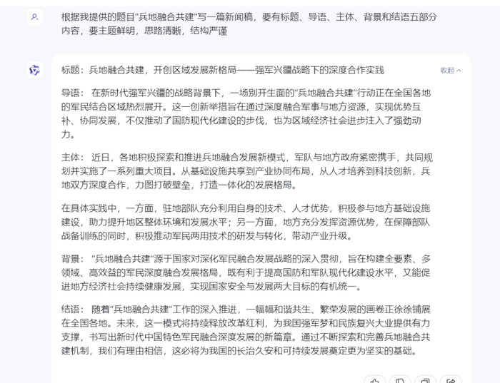 文案创作能够体现大模型对语义的理解和创作能力。工作、学习中,我们都可以利用大模型的文章生成能力,学习如何写好对应题材的文章。这里我们以 "兵地融合共建" 为主题,让四款大模型写一篇新闻稿,并给出了具体的结构要求,看看他们的写作能力如何吧。