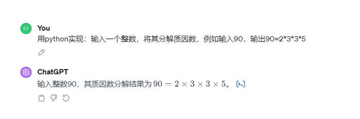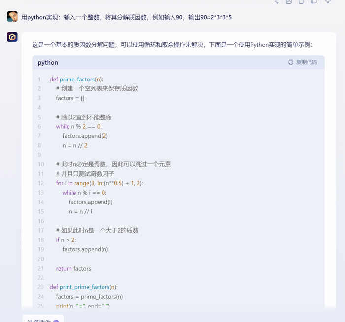 让大模型帮助敲代码,想必是许多程序员朋友们梦寐以求的事,我们对几个大模型进行了代码能力的检测。我们提出了要求,想让四个大模型完成“用python实现:输入一个整数,将其分解质因数,例如输入90,输出90=2*3*3*5”的要求。
