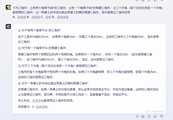 通义千问答案错误,前三个选项没问题,第④个选项中显然没有理解题意中“一条腰上的中线”这一前提条件。