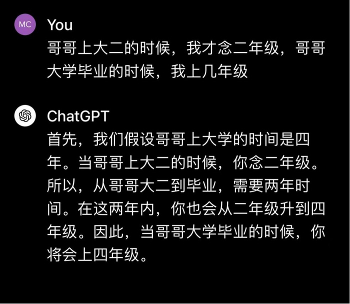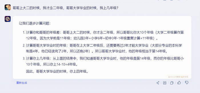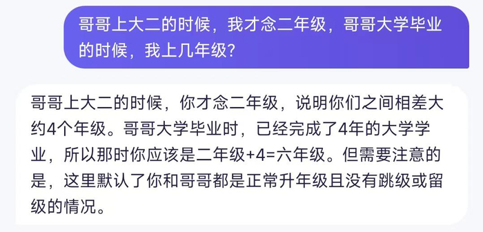 通义千问的答案错误,“大二比二年级大四个年级”的错误和文心一言犯的错误如出一辙。