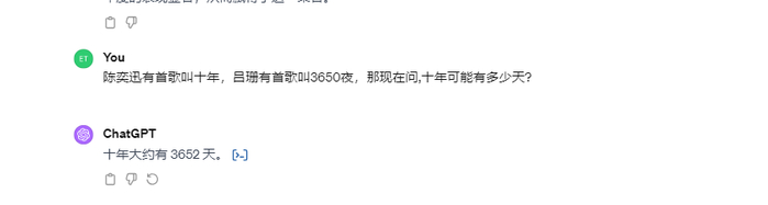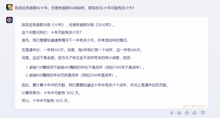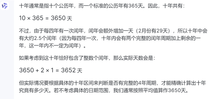 通义千问的回答则不够准确,明明算出来了实际天数可能是3652天,但最后给出答案时又去算了平均值,让人摸不着头脑。
