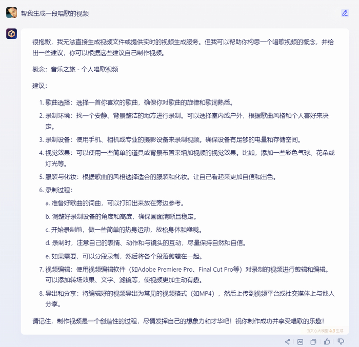 文心一言支持文生图、文生音频,但无法支持生成视频,他以文字的形式试图“反向激发”提问者。