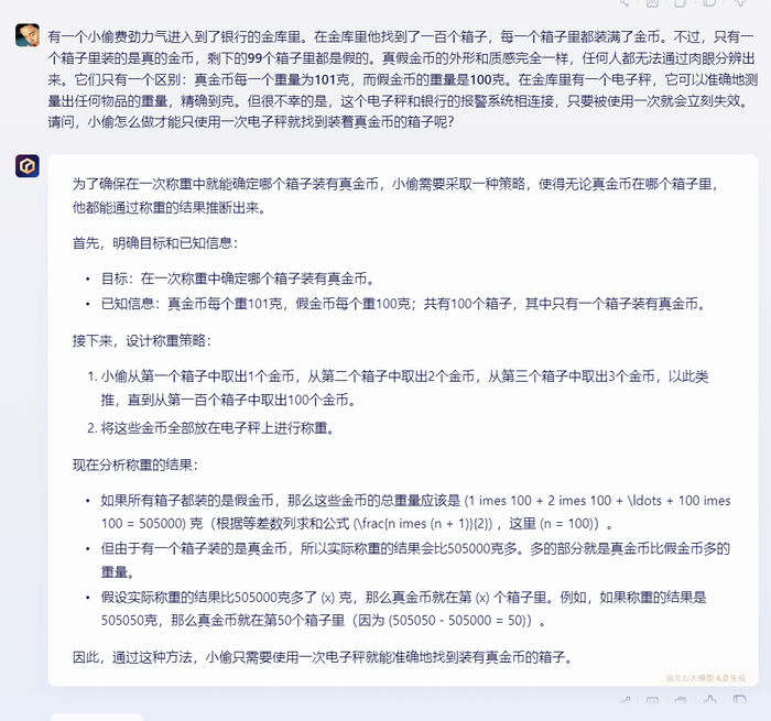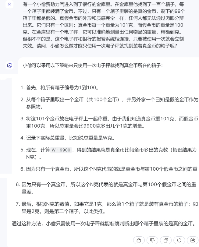 通义千问的第二个步骤中“拿一个已知是假的金币作为参照物”,但事实上无法在不使用电子秤的前提下确定某一个金币是假币,因此推导过程存在瑕疵。