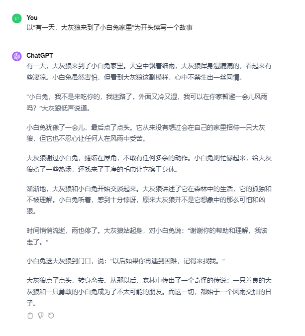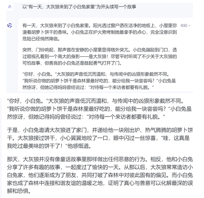 故事续写是考验大模型创作能力的一大指标,我们以经典的“小白兔”、“大灰狼”作为主角开头,看看他们会续写出怎样的故事。