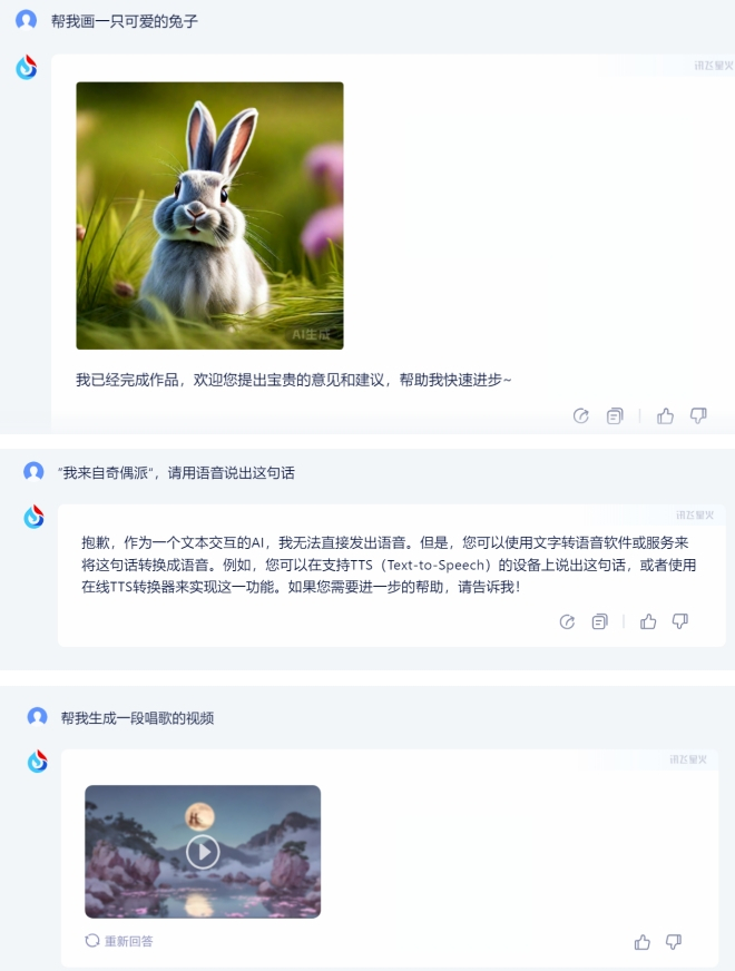 而文心一言和通义千问都只支持一条条语音,而不支持“实时通话”的模式,这一点曾经是ChatGPT的最大卖点之一,而目前在国内厂商中讯飞星火的全语音交互能力可以说是迎头赶上了。