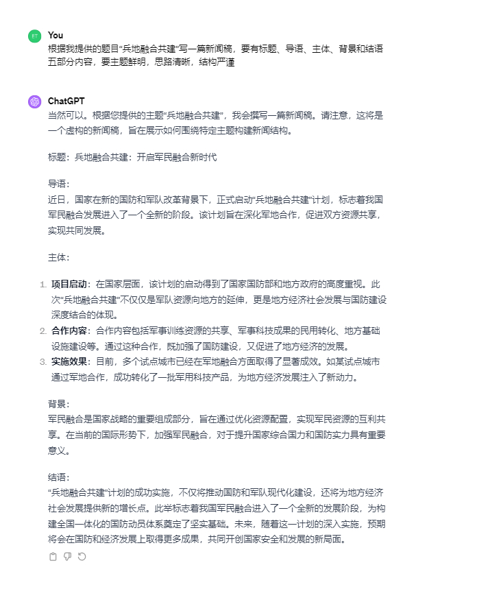GPT方面,生成的结果主题、结构都没问题,背景、结语也都紧扣“兵地融合”,表现优秀。