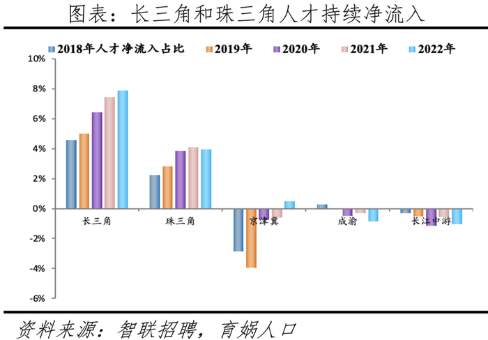 人口是一切经济社会活动的基础、人才更是第一资源。根据我们与智联招聘联合推出的《中国城市人才吸引力排名2023》,近年人才仍不断向东部城市集聚,长三角、珠三角城市群人才集聚能力逐渐增加。分区域看,2018-2022年东部地区人才净流入占比从5.7%增至14.1%,得益于雄厚的经济基础和较高的战略定位,人才持续向东部集聚;中部、西部地区人才持续净流出,且净流出占比加大。分城市群看,超6成人才流向五大城市群,长三角、珠三角人才持续集聚,2018-2022年人才净流入占比分别从4.6%、2.2%增至7.9%、3.9%;京津冀人才净流出趋势继续放缓,成渝、长江中游城市群人才净流出。随着人口红利消逝、人才价值日益凸显,如何吸引人才、留住人才并培养人才成为各城市提升综合实力的手段。