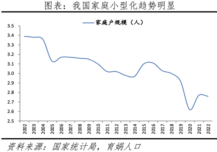 受我国人口流动日趋频繁、户籍制度改革不到位、年轻人不婚不育观念等因素影响,家庭户规模继续小型化,根据普查数据,2010-2020年平均每个家庭户规模由3.10人降至2.62人。人口流动日趋频繁,职业流动性增加,家庭成员间空间距离变大,年轻人更可能离开父母独立居住,一人户、“空巢”家庭和“纯老户”数量、比例均会增加。当前户籍制度改革进程明显滞后于人口流动趋势。流动人口无法享受与户籍人口均等的教育、医疗资源与公共服务,降低生育意愿。2020年平均每个家庭户人口为2.62人,比2010年第六次全国人口普查的3.10人减少0.48人。根据抽样数据,2021年,我国家庭户规模约2.77,2022年降至2.76,总体呈小型化趋势。