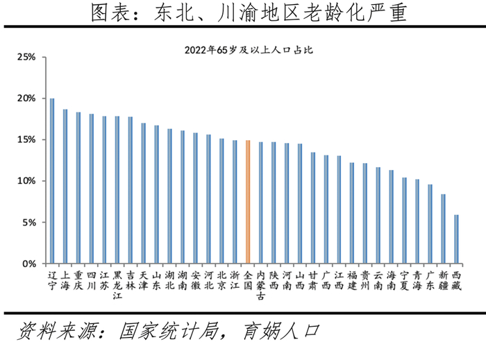 老龄化地域差异大,东北、川渝地区老龄化明显。分省看,2022年仅西藏65岁及以上人口占比低于7%,人口年龄结构较为年轻;新疆、广东、青海等11个省级以上地区65岁及以上人口占比介于7%-14%,初步进入老龄化;山西、河南、陕西、内蒙古4个省级以上地区65岁及以上人口占比大于14%,但低于全国平均水平;浙江、北京、河北等15个省级以上地区65岁及以上人口占比大于14%、进入深度老龄化阶段,其中,辽宁、上海、重庆、四川、江苏、黑龙江、吉林分别高达20.0%、18.7%、18.3%、18.1%、17.9%、17.8%、17.8%。