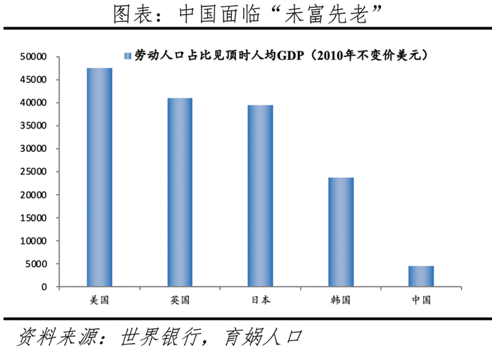 我们正从人口红利期转入人口负担期,面临“未富先老”挑战。人口数量红利是过去中国经济保持高速增长的一个重要因素。1978年改革开放后,中国依靠庞大且年轻的劳动力以及与之相关的巨大统一市场,快速成长为世界第二经济体。1962-1975年第二轮婴儿潮人口是改革开放40年的建设主力,生产和储蓄多,消费少,导致储蓄率和投资率上升,储蓄超过投资部分产生贸易顺差,同时过剩的流动性和人均收入水平提高推动消费升级,经济潜在增速较高。在长期低生育率背景下,中国15-64岁劳动年龄人口比例及规模分别在2010年、2013年见顶,而日本、美国、英国的劳动年龄人口比例分别在1991、2009、2013年见顶,当时的人均收入远高于中国。