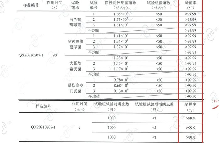 经检测,实验条件下,对白色葡萄球菌、金黄色葡萄球菌、大肠埃希氏菌、鼠伤寒沙门氏菌的除菌率高达99.99%,对于螨虫的杀灭率高达99.99%。