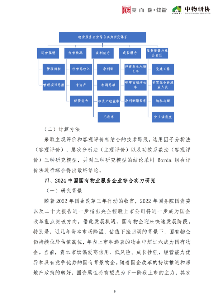 基于此,本次研究将持续聚焦国有物企,开展2024国有物业服务企业综合实力的研究工作。本次研究旨在通过科学、公正、客观的评价指标体系、评价方法,对行业发展的政策环境,上下游链、市场发展格局进行研究,并通过长期跟踪,发掘出一批综合实力强、资产优质、运营稳健、具有发展潜力和履行社会责任成绩显著的国有物企,并形成《2024中国国有物业服务企业综合实力研究报告》。