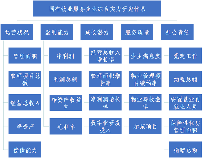 基于过往物业管理行业和企业相关研究中积累的经验,综合考量了物业服务企业目前的经营特点和未来的发展趋势,以及国有物企的特点,在物业服务企业综合实力研究指标体系的基础上,着重强调了物企在稳就业、保民生等社会责任和服务质量方面的重要性,最终拟定了2024中国国有物业服务企业综合实力研究体系。