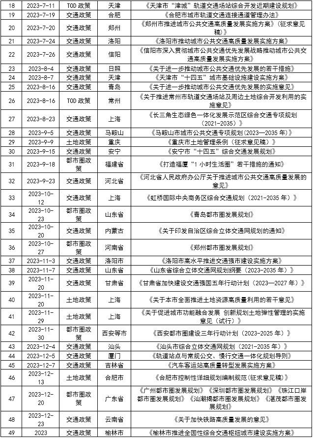 2023年,有30个省市发布了交通相关政策,佛山发布城市轨道交通条例,东莞、安宁等发布交通“十四五”规划,昆明、马鞍山和山东省发布综合交通规划,开封、安阳、濮阳、郑州等城市发布公共交通高质量发展实施意见,日照、青岛、信阳等城市发布公共交通优先发展相关政策,黑龙江、甘肃和洛阳发布交通强国文件,这些文件均不同程度的涉及TOD内容。具体政策如下: