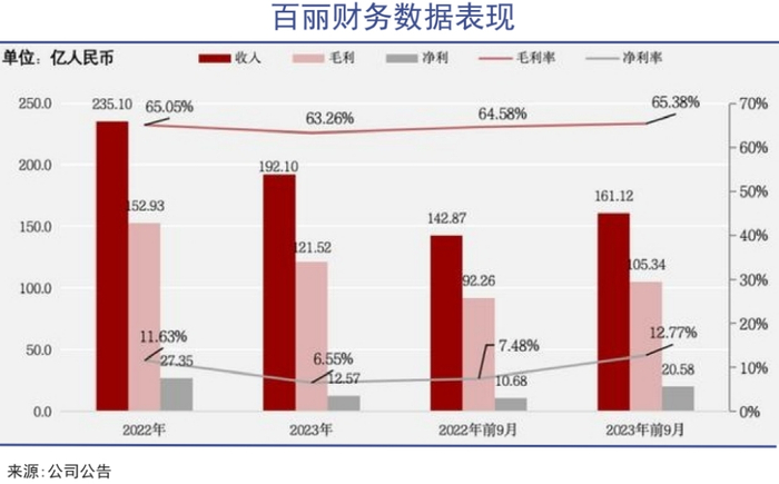 新百丽在重组之后显示出新的生机。公司业绩在2023财年(每年2月止)承压后,2023年度快速回暖,截止2023年11月底的9个月,实现161亿元,同比增长12.7%,净利润翻倍至20.58亿元。而且毛利率和净利率均刷新了两年来的新高。