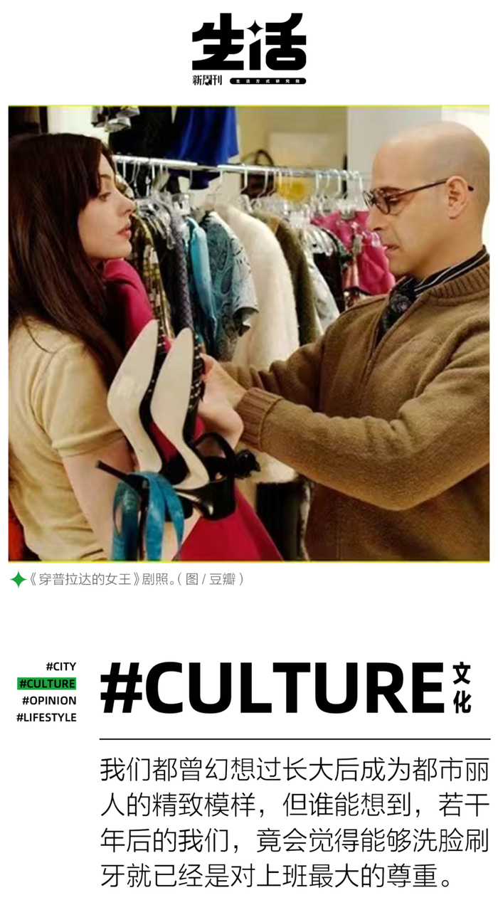 儿时,看着比自己漂亮成熟的女性站在身边,不由得一阵羡慕,恨不得自己一夜长大。再之后,第一支口红、第一双高跟鞋、第一套职业套装,都曾是彼时充满仪式感的瞬间。然而,随着对上班的厌烦,完全进化成一副截然相反的模样。