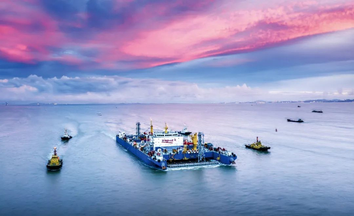 2023年6月8日,“一航津安1”号沉管运输安装一体船将E23管节和最终接头浮运至安装现场。