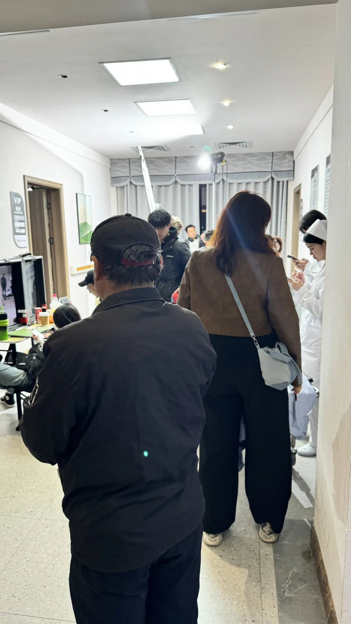 门口有演员和工作人员正在休息,还有一位身穿病号服的小演员。