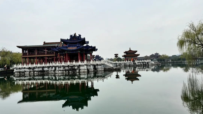 湖中亭子处的剧组看起来正在进行皇上御书房议事,我们决定前往朝见。