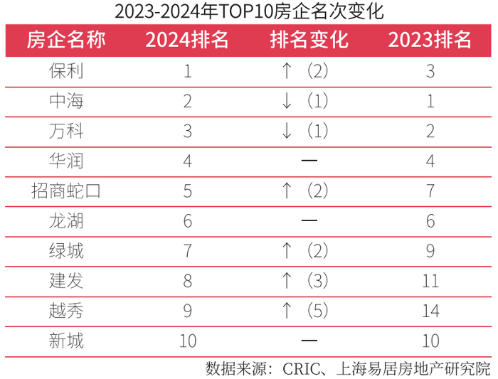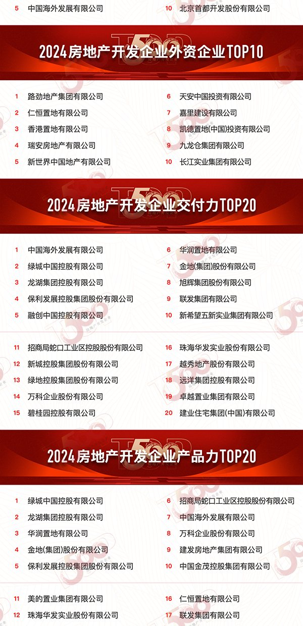 测评研究报告显示,2024房地产开发企业综合实力TOP500前三位由保利、中海、万科占据。其中,保利超越中海、万科,升至第一,华润保持第四,招商蛇口、龙湖、绿城、建发、越秀、新城分列第五至第十位。
