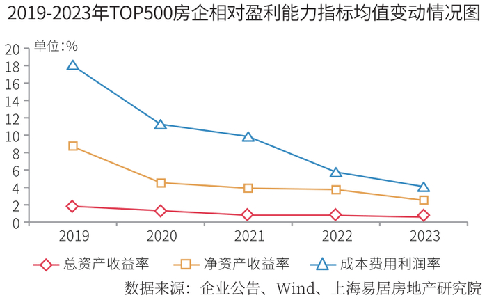 2023年,TOP500房地产开发企业总资产收益率均值为0.56%,较上年下降了0.20个百分点;净资产收益率均值为2.49%,较上年下降了1.25个百分点;成本费用利润率均值为4.06%,较上年下降了1.68个百分点。