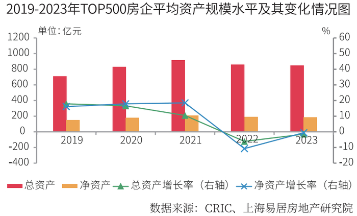 2023年,TOP500房地产开发企业总资产均值为847.85亿元,同比下降1.50%;净资产均值为188.16亿元,同比下降0.56%。2023年TOP500房企总资产、净资产规模继续下降,但降幅较上年有明显收缩。