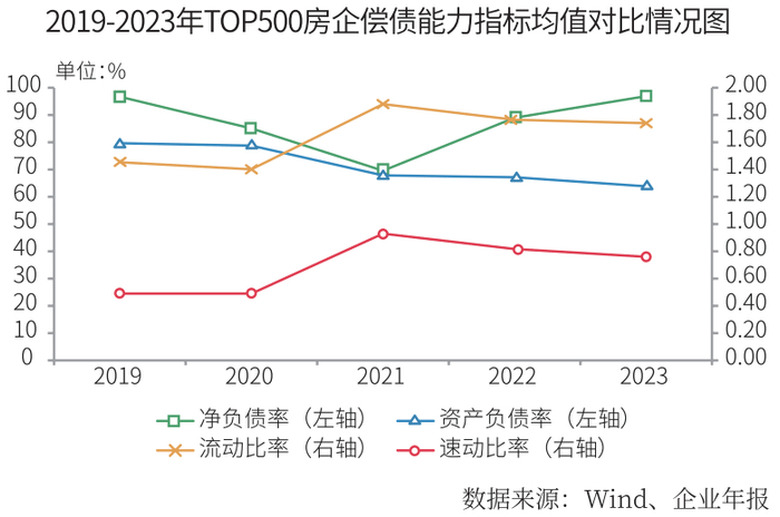 从长期偿债能力看,TOP500房企2023年资产负债率均值为63.84%,较上年下降3.34个百分点;净负债率均值为96.92%,较上年上升7.94个百分点,负债维持在高位。短期偿债能力方面,2023年TOP500房企流动比率均值为1.74,较上年下降0.03;速动比率均值为0.76,较上年下降0.06,二者较上年均有小幅下滑。有超过七成的房企速动比率小于1,可变现的流动资产无法覆盖流动债务,短期偿债压力加大。