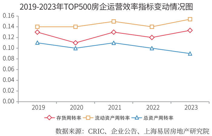 2023年TOP500房地产开发企业存货周转率均值为0.13,较上年提升0.01;流动资产周转率均值为0.15,较上年提升0.01;总资产周转率均值为0.09,较上年下降0.01。在保交付的压力及降杠杆的迫切需求下,房企加快了周转速度,同时投资态度谨慎,存货总量下降,TOP500房企存货周转率和流动资产周转率均值实现了同比小幅上升。受销售金额下降影响,总资产周转率均值继续下滑。