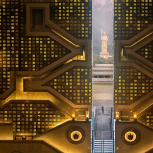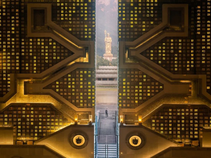 我在2007年第一次上山时就有幸在黄昏时拍了这张神奇的照片。此时太阳即将落下,最后一抹夕阳打在半山腰的禅寺,远处一尊庄严安详的佛祖仰天静卧头像在天地间无比清晰!