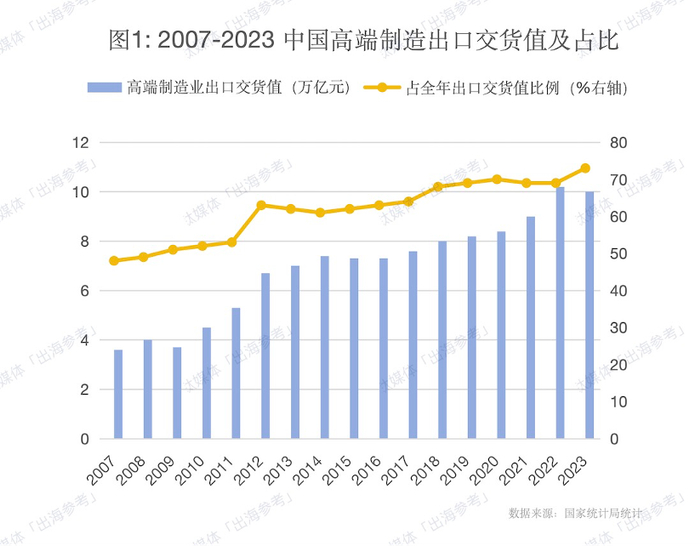 近些年,高端制造业正在成为我国外贸的增长引擎。国家统计局数据显示,2023年医药制造业、通用设备制造业、专用设备制造业、汽车制造业、通信设备/计算机及其他电子设备制造业、化学纤维制造业、电气机械及器材制造业、铁路/船舶/航天和其他运输设备制造业、仪器仪表制造业等9大高端制造行业的出口值达到10.65万亿元,占全年出口交货值比例72.84%,创历史新高。