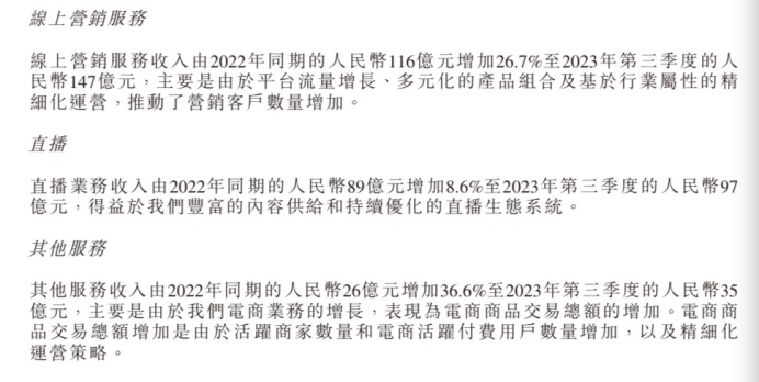 具体分析,其线上营销服务、直播、其他服务三大主营业务,从全年来看也均呈上升态势。其中,快手在线营销服务收入为603亿元,同比增长23.0%;直播业务收入为391亿元,同比增长10.4%;其他服务收入为141亿元,同比增长44.7%。